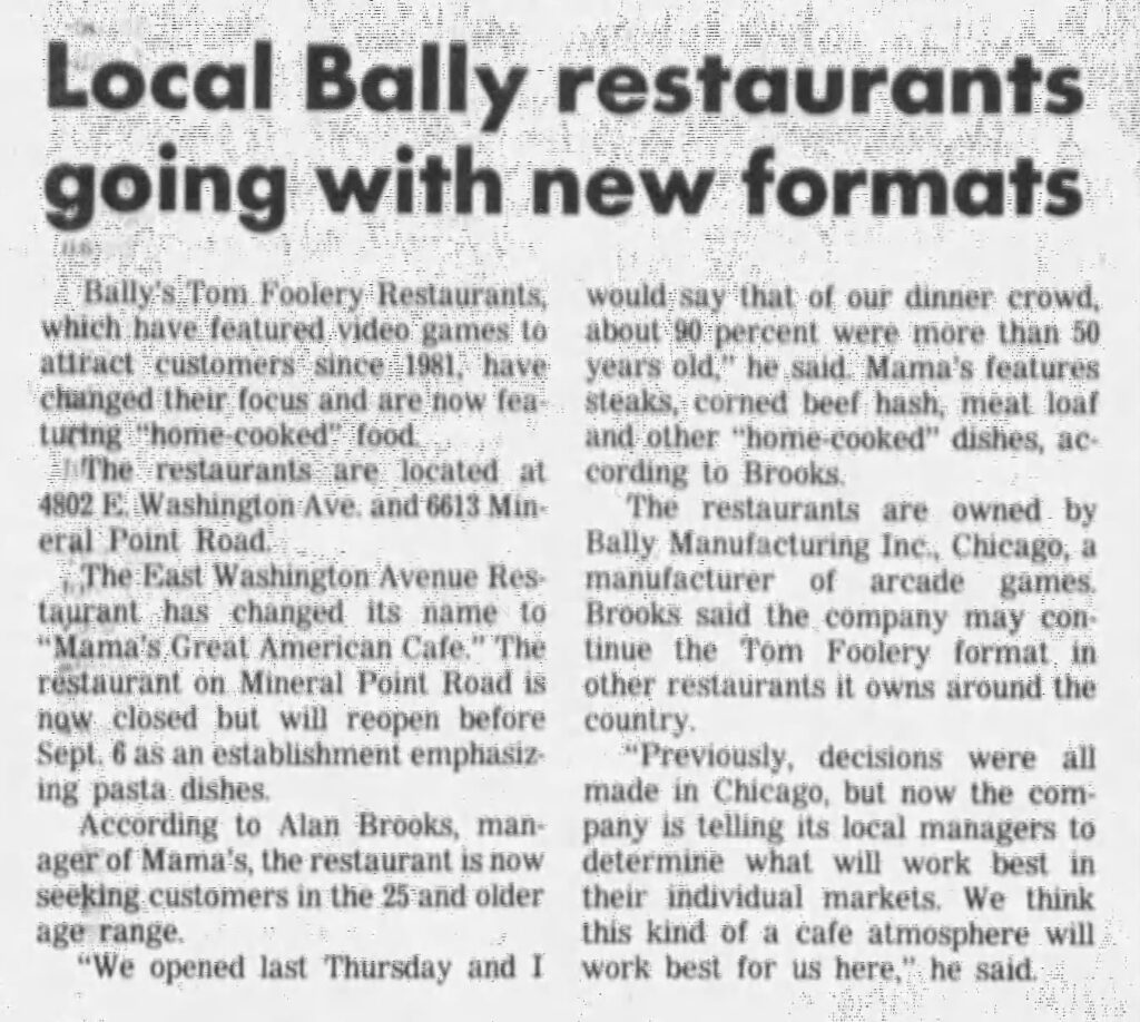 In January 1984, we see our first historical mention of the Milwaukee location. Meanwhile, the arcade crash has begun to take its toll on Bally Corporation, who stretched themselves quite thin during their boom years. Capital has begun to run dry and Tom Foolery's parent company realizes that running a restaurant chain isn't as easy nor profitable as they had thought it would be. As a last ditch effort, the Madison locations are converted into alternate restaurant concepts sans arcade games - Mama's Great American Cafe and Fresco Pasta Cafe. Sadly, these pivots didn't make much of a difference.