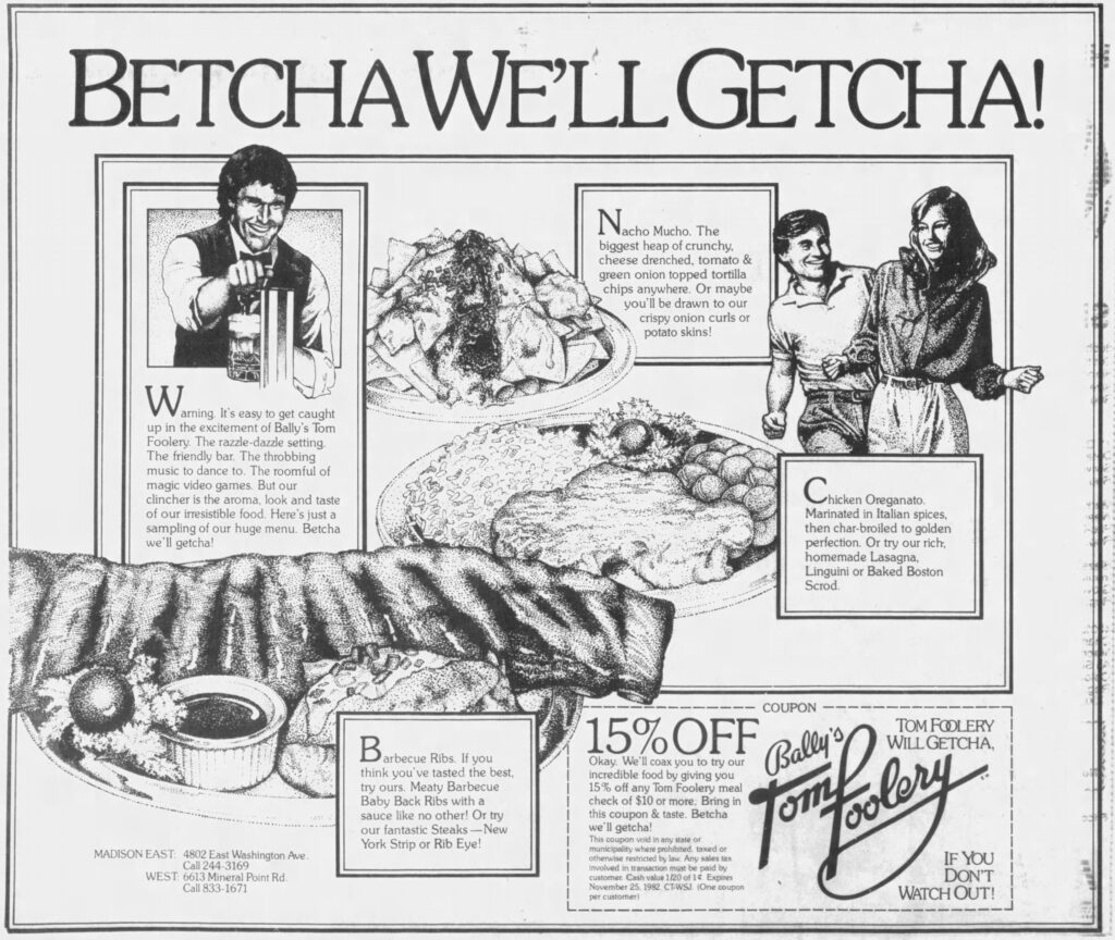 The first 3 of Bally's Tom Foolery concepts have their grand openings in 1982: two of these are in Madison, WI and one is in Chicago Ridge, IL, in Chicago Ridge Mall. The Madison locations (East and West) open in March and Chicago Ridge opens in December.